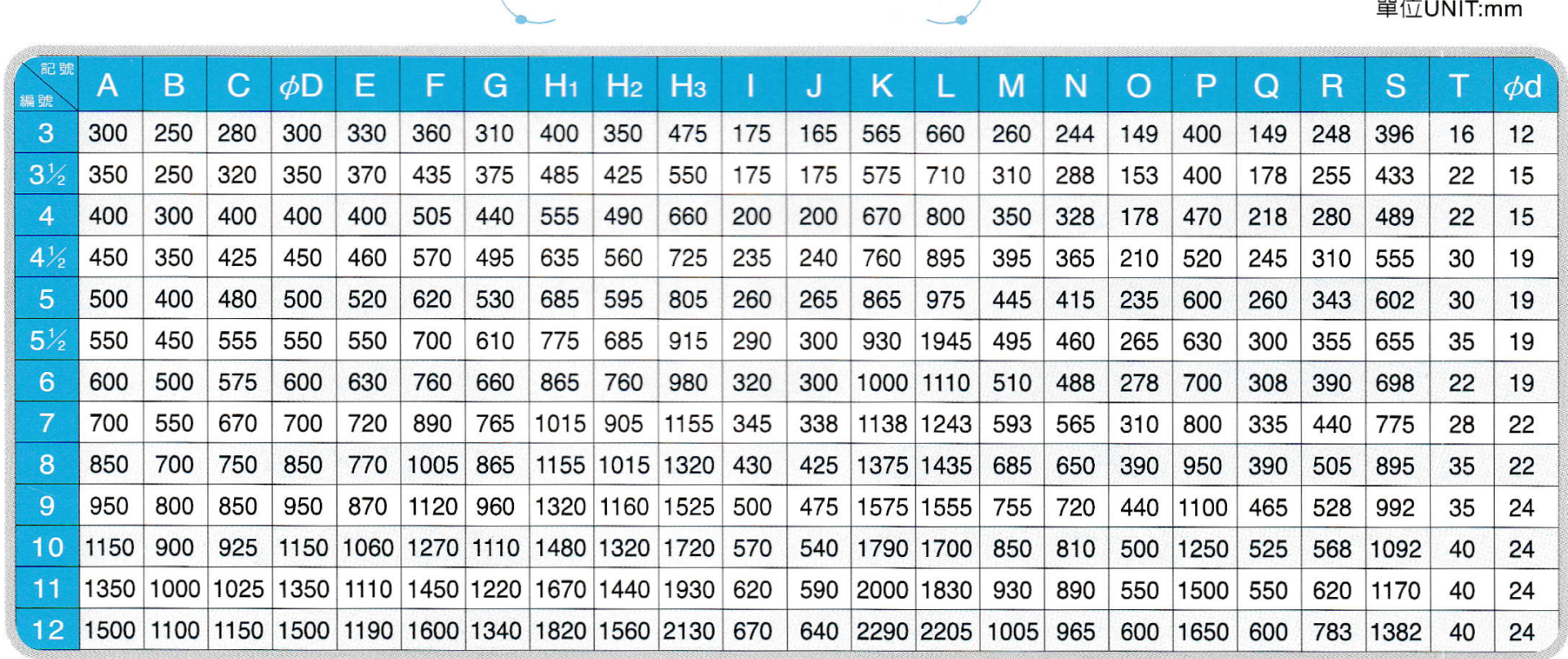 尺寸表Dimensions